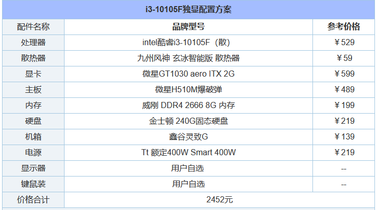 i3-10105F相比i3-10100F同为4核8线程,拥有6MB三级缓存,但主频和最高睿频均提高了0.1GHz,极小的性能提升。i3-10105F性能大致相当于i5-9400F,由于F版本所以没有内置核显,价位上自然便宜不少,主要针对上独显的玩家。对于GT1030这类入门级显卡,在1080P下玩玩LOL、守望先锋、CF、DNF轻量级游戏完全是没有问题的,GTX1030实测英雄联盟极高画质下可以跑到140帧左右。如果预算三千出头,可以将显卡提升至1050Ti,当然不在乎几百预算建议CPU提升至i5 10400F。