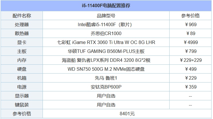 这套配置相当于上一套,对配置方案略有修改,主板替换为华硕TUF系列的B560主板,机箱换个外观等,主要是显卡选用了RTX3060Ti。RTX3070虽然相比RTX3060Ti性能提升了10%左右,但是从价格来看,GTX3060Ti性价比更高,这也是公认的,当然喜欢RTX3070的朋友也可以考虑。