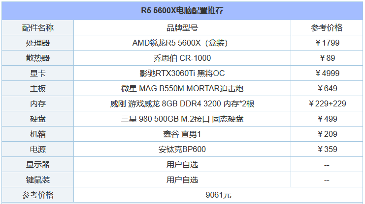 AMD锐龙R5 5600X对应的竞品是intel酷睿i5 11600KF,刚推出R5 5600X的时候,价格一直维持在2千出头,目前终于跌破了2千元内大关。R5 5600X基于7纳米全新的Zen3架构设计,R5 5600X拥有6核12线程,基础频率为3.7GHz,加速频率为4.6GHz,三级缓存为32MB,最大的内存支持3200MHz,TDP功耗为65W,无内置核显,支持PCI-e4.0。RTX3060Ti的性能基本相当于上一代RTX2080Super,所以在2k高画质下可以流畅各类3A游戏大作。