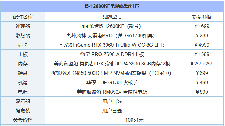 intel第12代i5-12600KF是现阶段最便宜的12代CPU了,为10核16线程,采用6大核+4小核的设计,最大睿频4.9GHz,intel智能高速缓存(三级)为20MB,热设计功耗为125W,支持DDR4 3200及DDR5 4800频率的内存。由于考虑到是i5平台,本套配置就不考虑更贵的DDR5内存,目前16GB DDR5 4800MHz至少一千多,加上DDR5版本的Z690主板,装机预算更贵了,关键提升不大,内存时序高,导致延迟还高。暂且显卡选择的是RTX3060Ti,可以根据自己预算和需求考虑,如果对显卡没有要求,去掉显卡,将CPU替换为i5-12600K核显版即可。