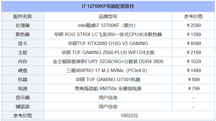 i7-12700K采用的是8大核(P核,性能核,主攻单核性能)+ 4小核(E核,效能核,主攻多线程优化)的设计,共有12个核心和20个线程,大核的最大睿频为5.0GHz,intel智能高速缓存(三级)为25MB,TDP热设计功耗为125W。考虑到预算,这套配置也没有采用DDR5内存,主要是目前支持DDR5主板和DDR5内存有点贵了,不过在硬盘上选择了性能更快的PCIe4.0固态。显卡方面,可以按需选择,例如RTX3060、RTX3060Ti、RTX3070、RTX3070Ti、RTX3080、RTX3080Ti以及RTX3090。